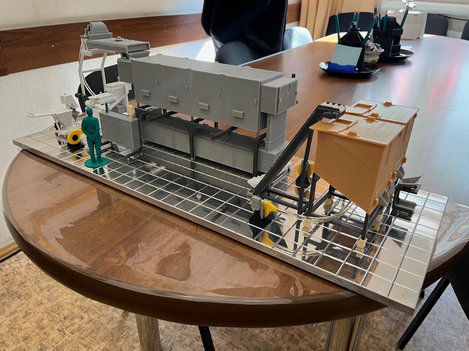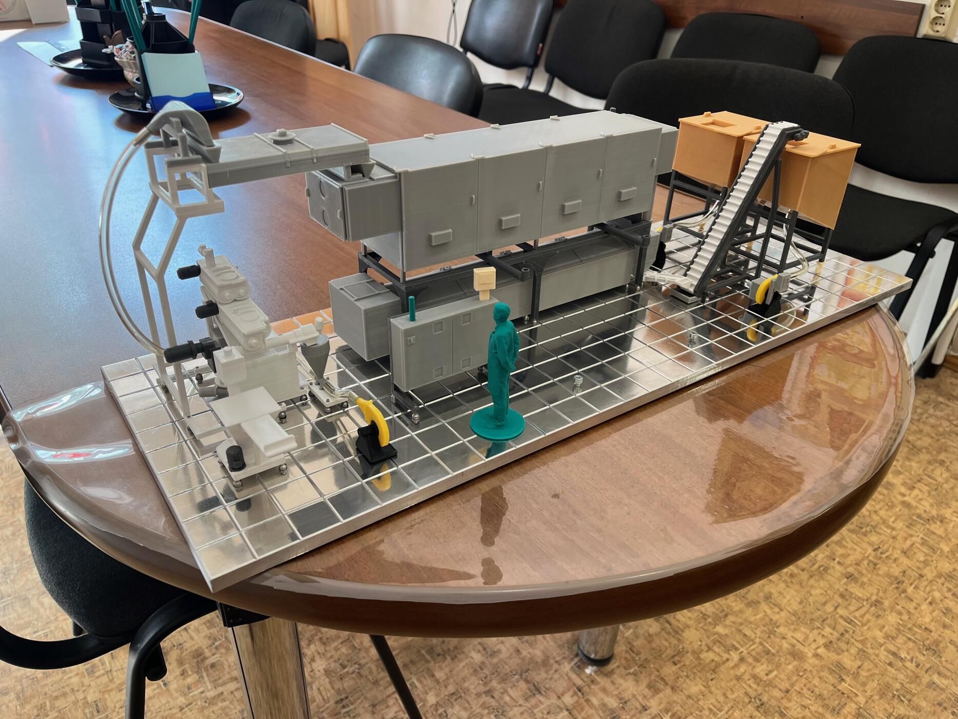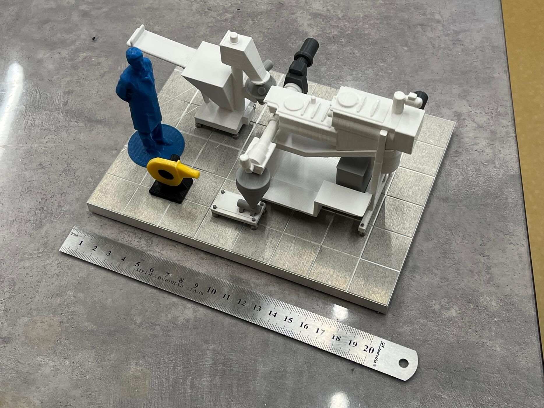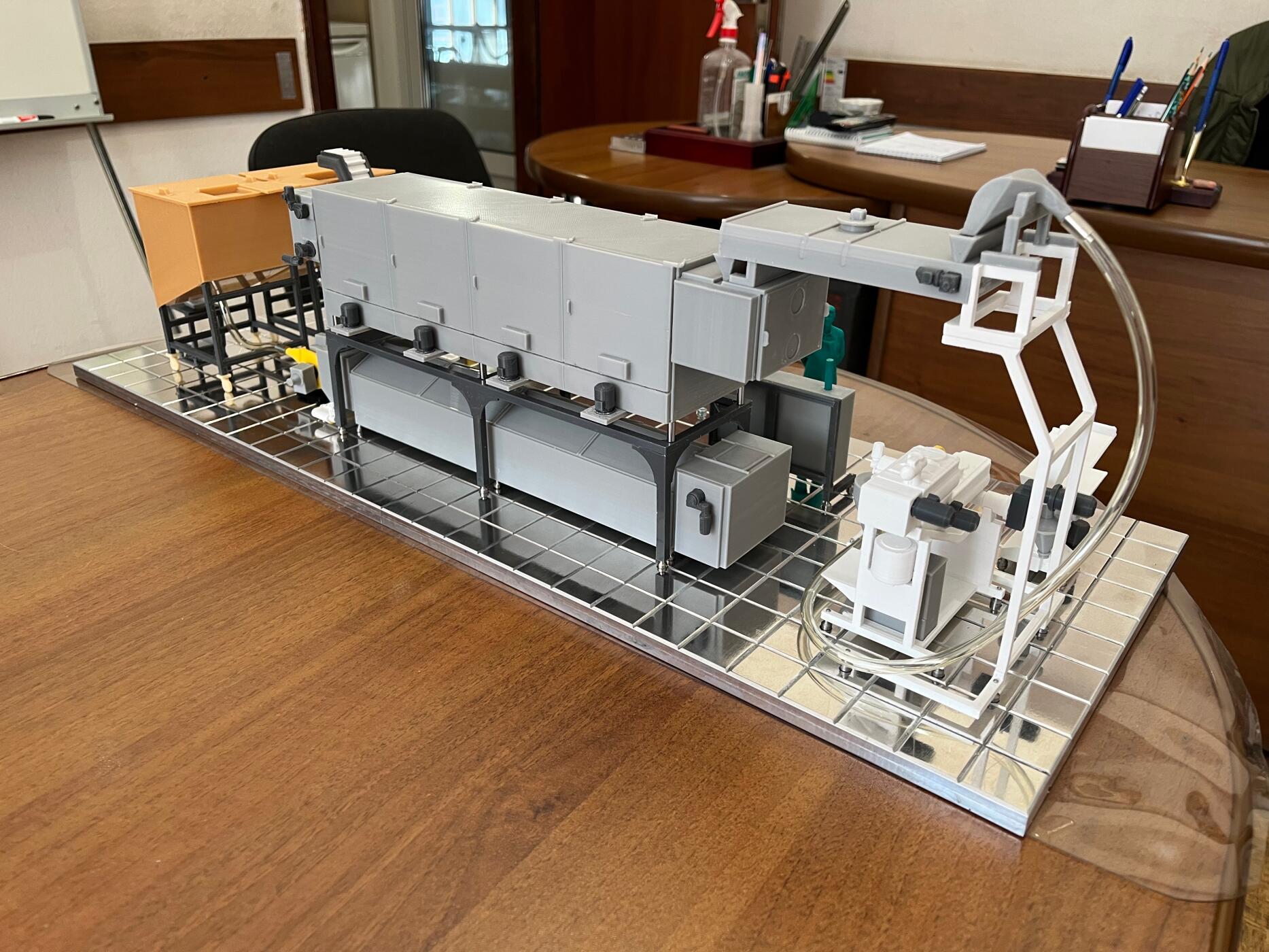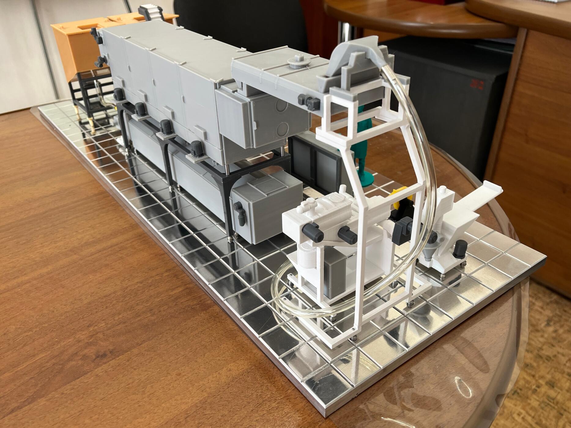 Многие мелкие элементы при таком масштабе буквально исчезают, поэтому пришлось переработать конструкции, разделить оборудование на удобные для 3D-печати сегменты и продумать цветовую схему — чтобы визуально различать материалы и покрытия.