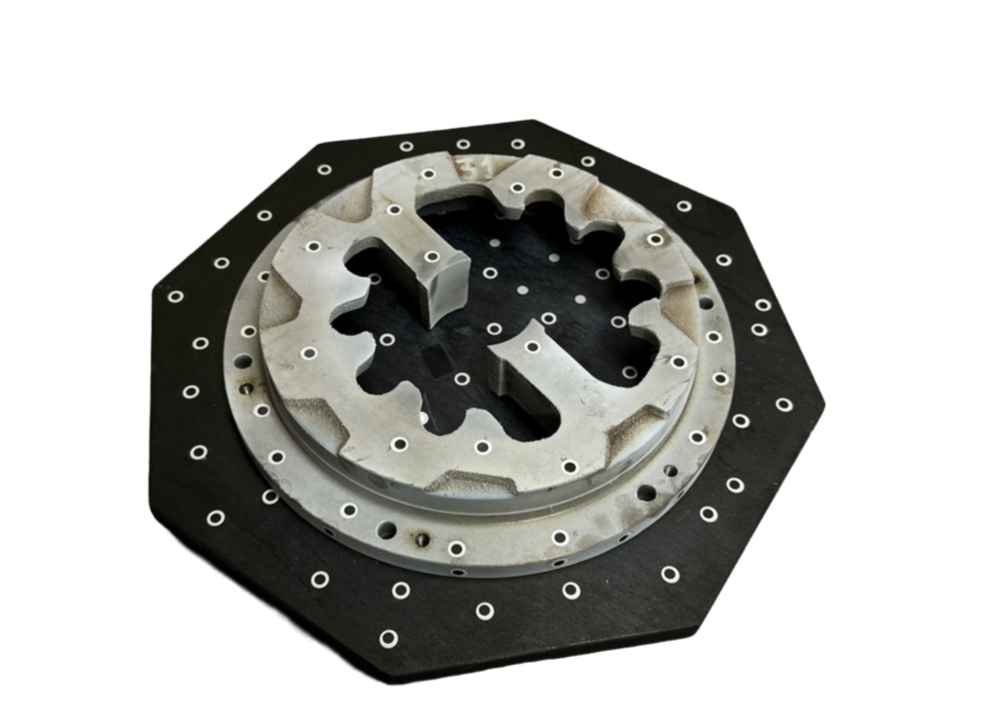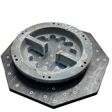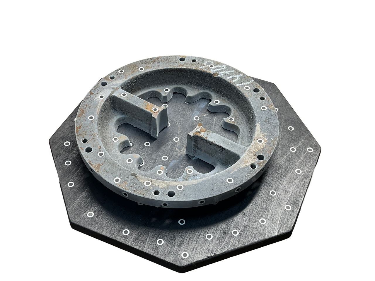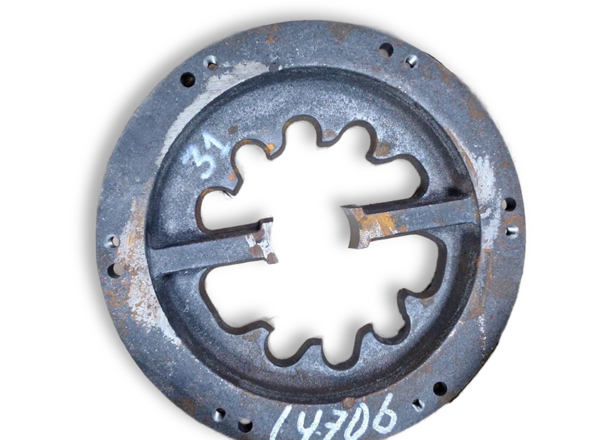 Исходная деталь — фланец с центральным профилем сложной формы и крепёжными отверстиями по окружности. Есть обработанные поверхности, которые использовались как базы при построении модели, и литые участки без обработки.